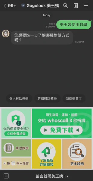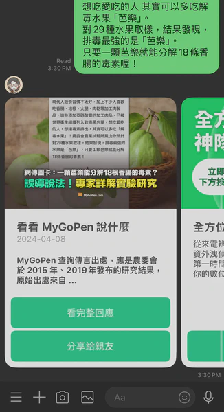 - 謠言查證:貼上可疑傳言,美玉姨會比對真的假的Cofacts、台灣事實查核中心、MyGoPen等三大查證資料庫