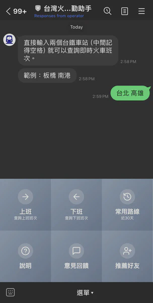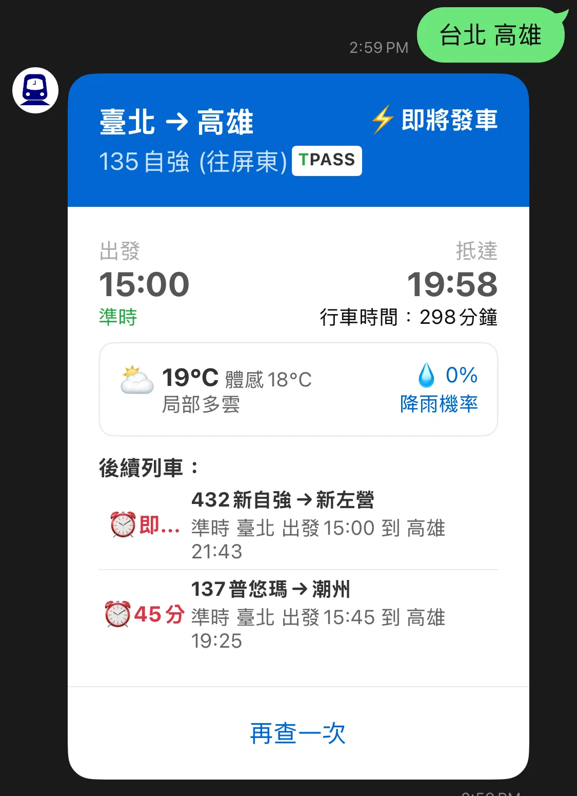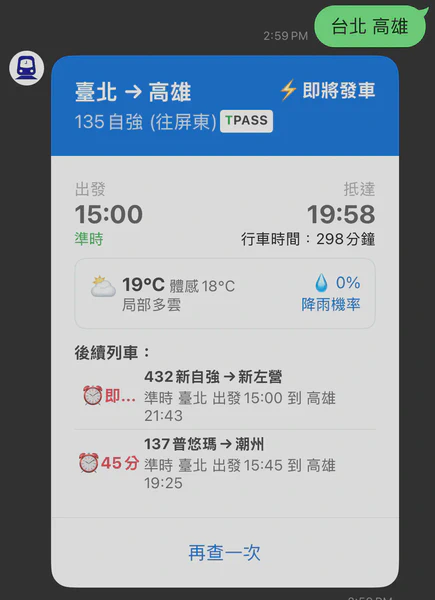 最簡單的使用方式就是直接輸入「起站 迄站」(例如:台中 台北),系統就會回傳該區間的即時班次、票價與行車時間。也可以設定常用路線,系統會自動記錄你最常查詢的路線。